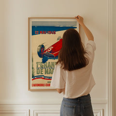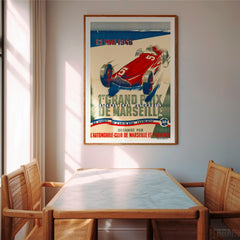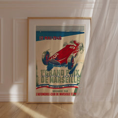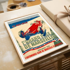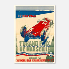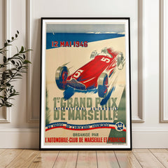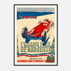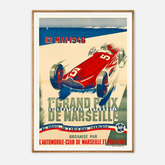Experience the thrill of classic motorsport with this vintage racing poster, featuring the 1er Grand Prix de Marseille from 1946. Illustrated by acclaimed artist André Bermond, the print captures the dynamic speed and excitement of the roaring red race car against the bold backdrop of Marseille. This art print is meticulously reproduced on 250 gsm museum-quality paper using top-branded inks to preserve the vibrant colors and fine details. Available in premium sustainable wooden frames in n...