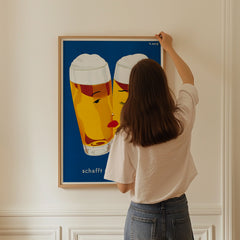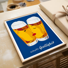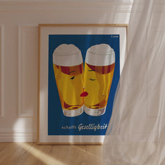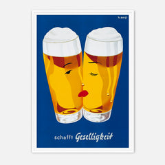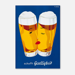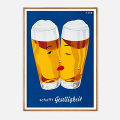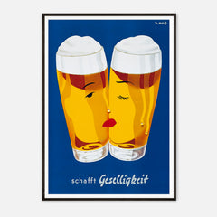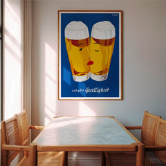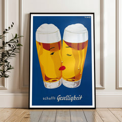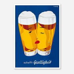 Celebrate the convivial spirit with this classic Schafft Geselligkeit beer print. This vintage advertising artwork features two beer glasses with stylized faces, set against a rich blue background, invoking a sense of warmth and camaraderie. The bright yellow hues of the beer are complemented by the minimalist yet charming design. This high-quality art print is expertly recreated on 250 gsm museum-quality paper using top-branded inks, ensuring lasting vibrancy and detail. Choose from our p...