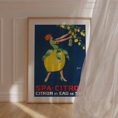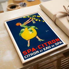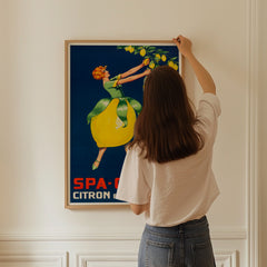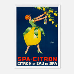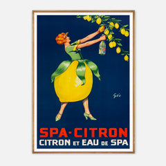 Experience the vibrant charm of this vintage French poster created by the artist Géo. The Spa-Citron art print beautifully showcases a whimsical figure joyfully reaching for a bottle of lemon drink, set against a striking blue background with lush lemon tree branches. This high-quality art print is produced on 250 gsm museum-quality paper using top-branded inks, ensuring the vibrancy of the original artwork. Each print can be framed in our premium sustainable wooden frames available in nat...