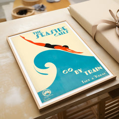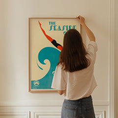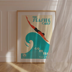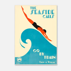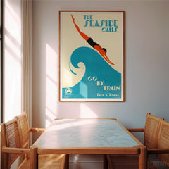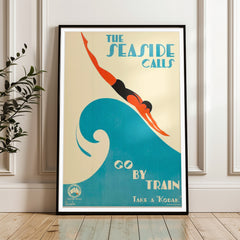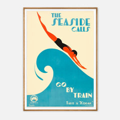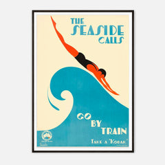 Bring the charm of the 1930s with 'The Seaside Calls' vintage travel poster. This classic art print captures a diver leaping into a vibrant blue ocean wave, encouraging viewers to 'Go by Train.' Perfect for adding a touch of retro elegance to any room, this print is an ideal choice for nostalgic art lovers and coastal decor enthusiasts. The high-quality art print is meticulously crafted on 250 gsm museum-quality paper using top-branded inks. Choose from our sustainable, premium wooden fram...