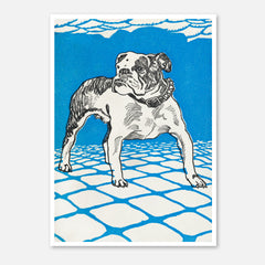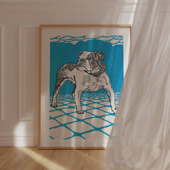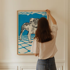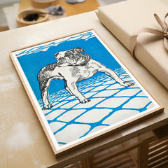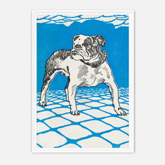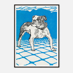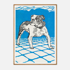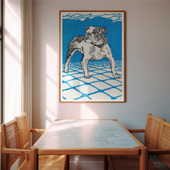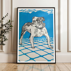 Introduce a touch of whimsical charm to your space with this delightful vintage illustration of a bulldog. This art print beautifully captures the detailed and expressive lines of a bulldog standing on a patterned ground under a stylized sky. The striking use of black, white, and blue creates a captivating contrast that brings the bulldog to life. Printed on 250 gsm museum-quality paper using top-branded inks, this artwork ensures a premium feel and long-lasting vibrancy. Choose from our p...