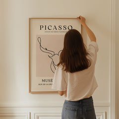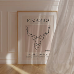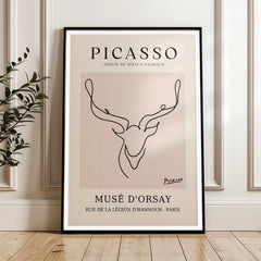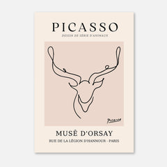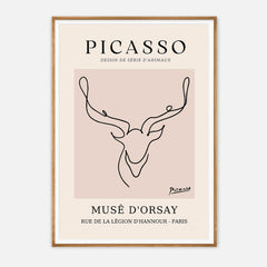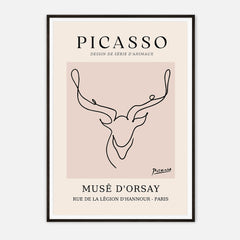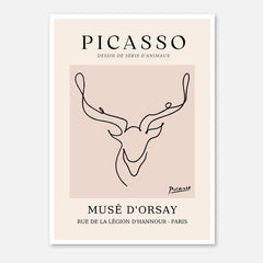 Experience the elegance of Pablo Picasso's minimalist line art with this exquisite print from his 'Drawings of Animals' series. Featuring the graceful form of a deer's head with delicate, flowing lines, this artwork embodies simplicity and sophistication. Each piece is printed on 250 gsm museum-quality paper with premium inks to ensure the fidelity of every stroke. Available in sustainable wooden frames in natural, black, and white finishes, this print is a perfect addition to any modern l...