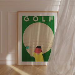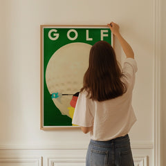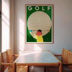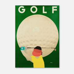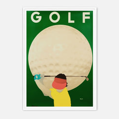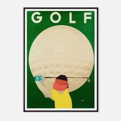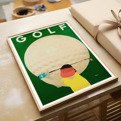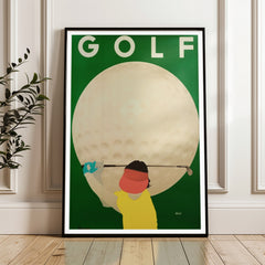 Introduce a touch of vintage charm to your space with this classic sports art print by Razzia. The vibrant poster showcases a golfer poised in action against the backdrop of an enlarged golf ball, epitomizing the essence of the sport with a retro twist. The striking contrast between the green background and the bold colors of the player captures the spirit and energy of golf. This high-quality art print is produced on 250 gsm museum-quality paper using top-branded inks, ensuring impeccable...