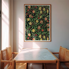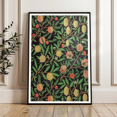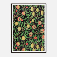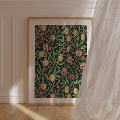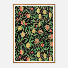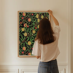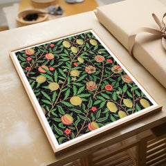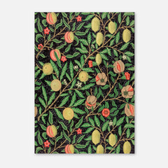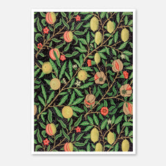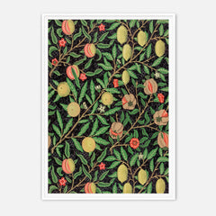 Admire the intricate craftsmanship of William Morris with this exquisitely designed ‘Fruit Garden’ art print. The rich botanical pattern features an array of fruits such as peaches, lemons, and pomegranates, adorned with detailed foliage against a deep black background. Each element showcases Morris's signature style, bringing a sense of timeless elegance and natural beauty into your space. This art print is produced on 250 gsm museum-quality paper and employs top-branded inks to ensure la...